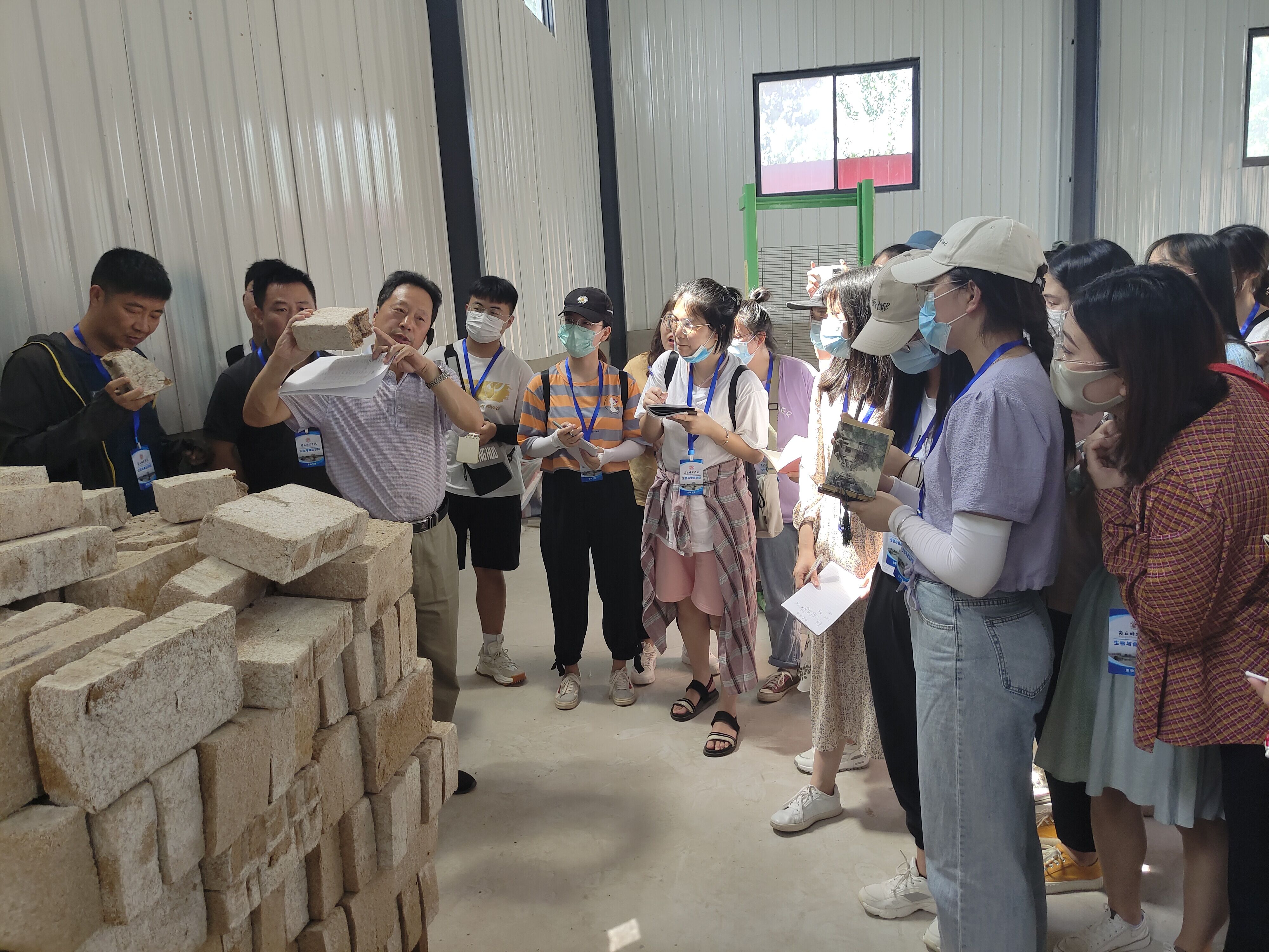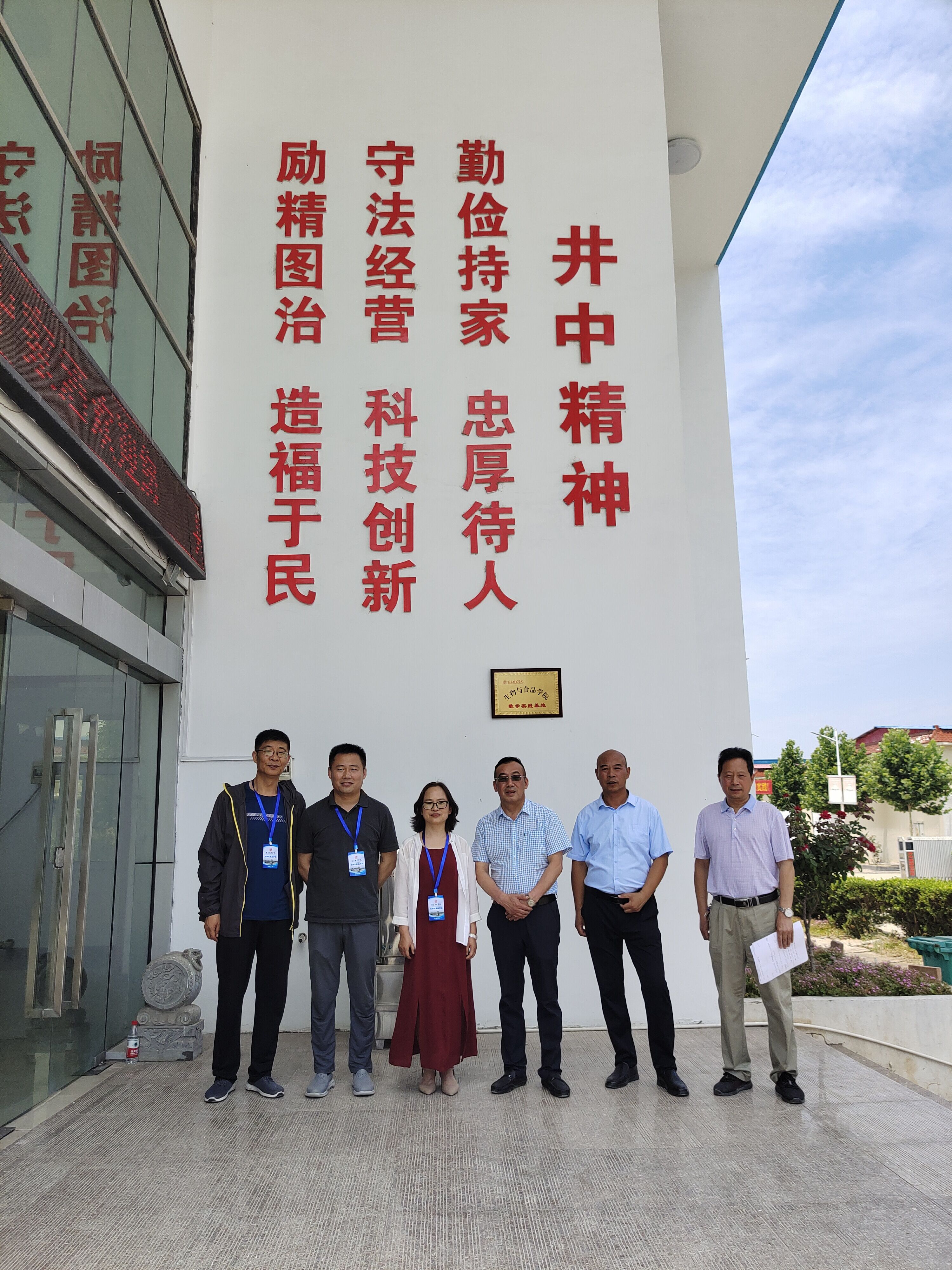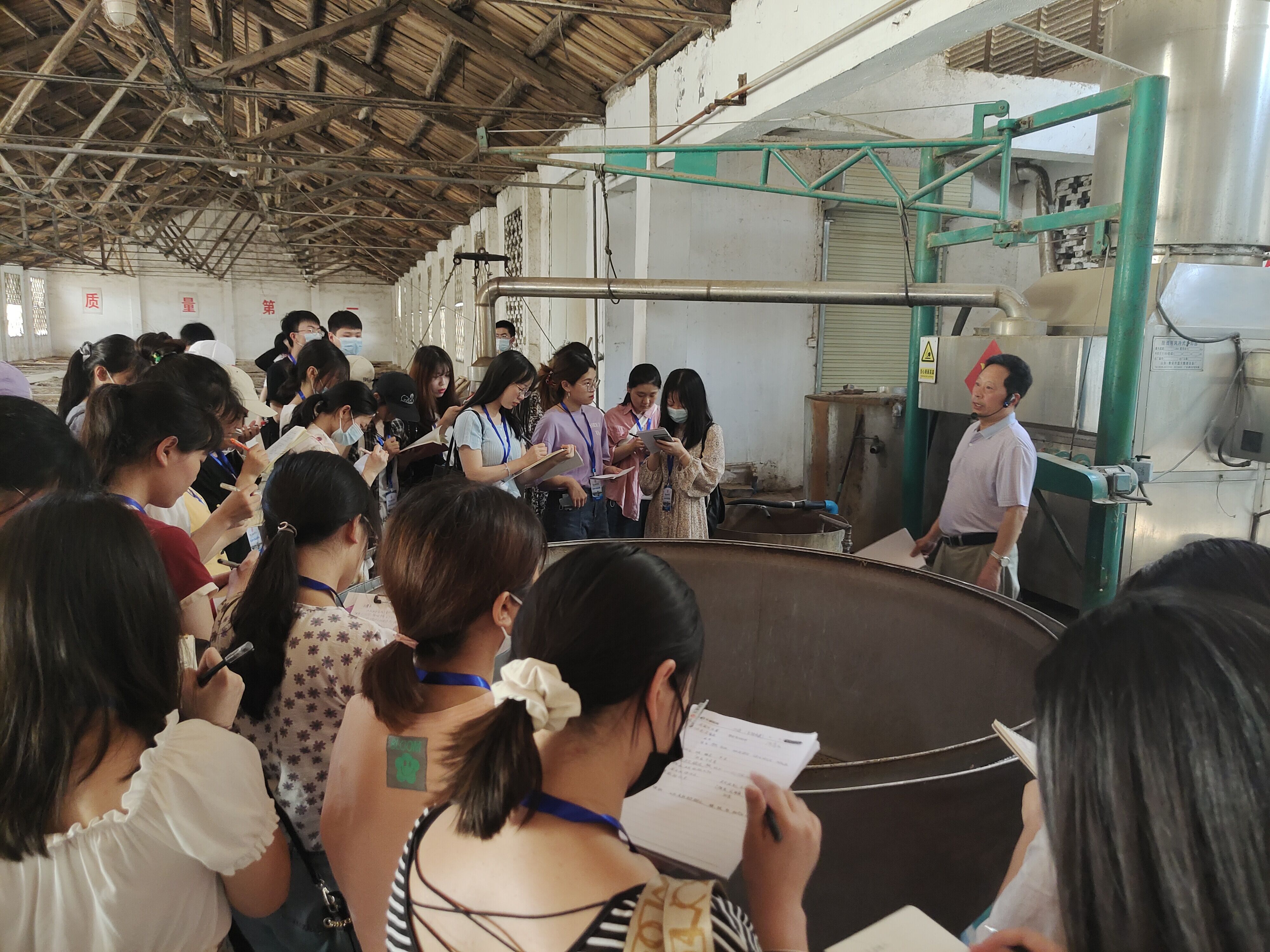 6月21号上午,师生们首先来到了位于商丘市睢阳区的井中家酒酿造生产基地。负责人李宏光先生首先带领大家来到存放酒糟的车间,并跟大家详细介绍了酒糟的制作工艺和存放条件和时长等。随后李总带领大家来到了发酵酿造车间,跟大家介绍了酵泥的制作流程。在此期间,同学们针对李总的讲解纷纷提出了自己的疑问,李总都进行了详细解答。紧接着李总又向大家介绍了制酒的流程和取酒的工序,大家了解到工人师傅是通过酒花来判断酒的质量,且不同时间内流出的原酒品质不同,刚开始流出的属于酒头一般用来勾调成品酒的口味,接着流出的原酒依次是特级,优级、一级和普通,最后就属于酒尾,也是用来勾兑调味成品酒。