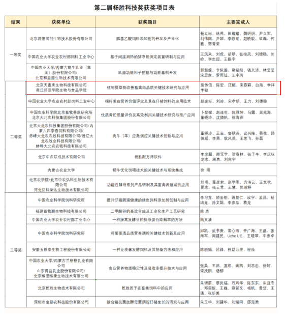 杨胜先生是著名动物营养学家,是我国现代动物营养与饲料科学的奠基人之一,杨胜科技奖是为推动我国农业科技进步,奖励在农业应用研究领域做出突出贡献的科技人员的奖项,奖项遵照“公开、公平、公正”的原则,通过奖励宣传、项目征集、组织评审,以面向科技前沿、国家重大需求的重点课题展开评选。第二届杨胜科技奖共有18个项目获奖,其中一等奖3个,二等奖7个,三等奖8个。