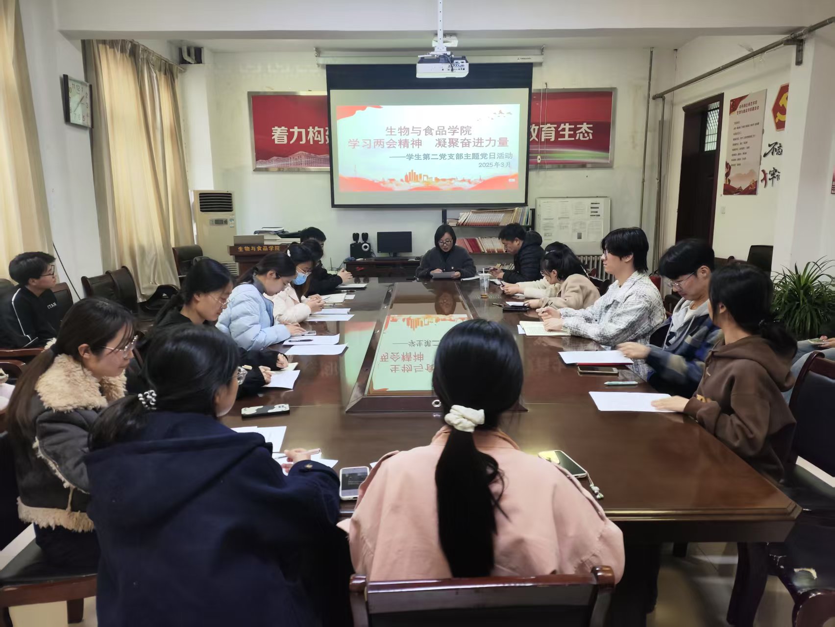 3月14日,员工第二党支部开展“学习两会精神,凝聚奋进力量”主题党日活动。全体师生党员共同学习两会重要文件,包括政府工作报告、全国人大常委会工作报告以及政协常委会工作报告等内容。通过对报告中关于教育改革、科技创新、民生保障等与师生息息相关领域内容的深入解读,帮助师生党员把握国家发展大势,明确教育事业在新时代的使命与责任。随后,师生们围绕学习内容展开热烈讨论,大家结合自身学习和工作实际,分享学习感悟。