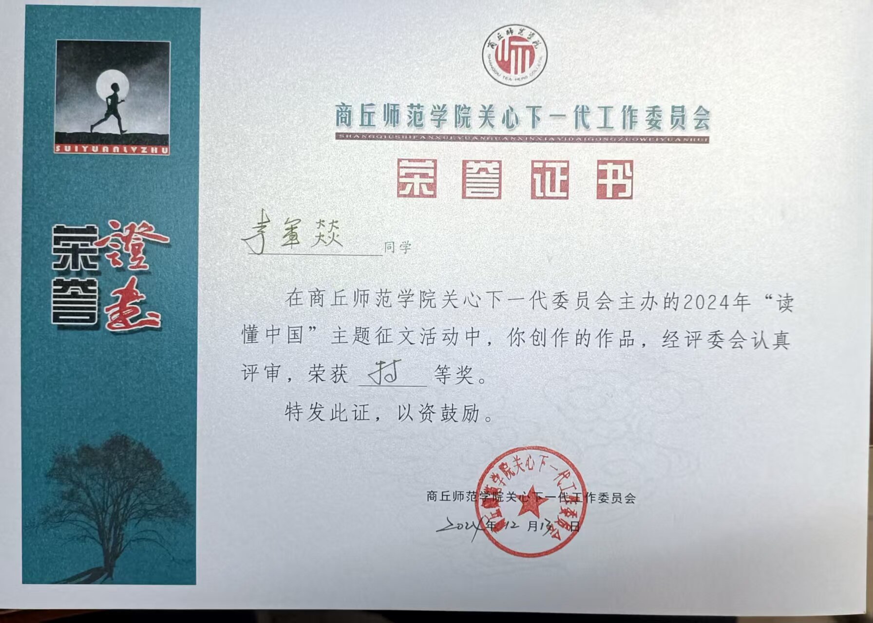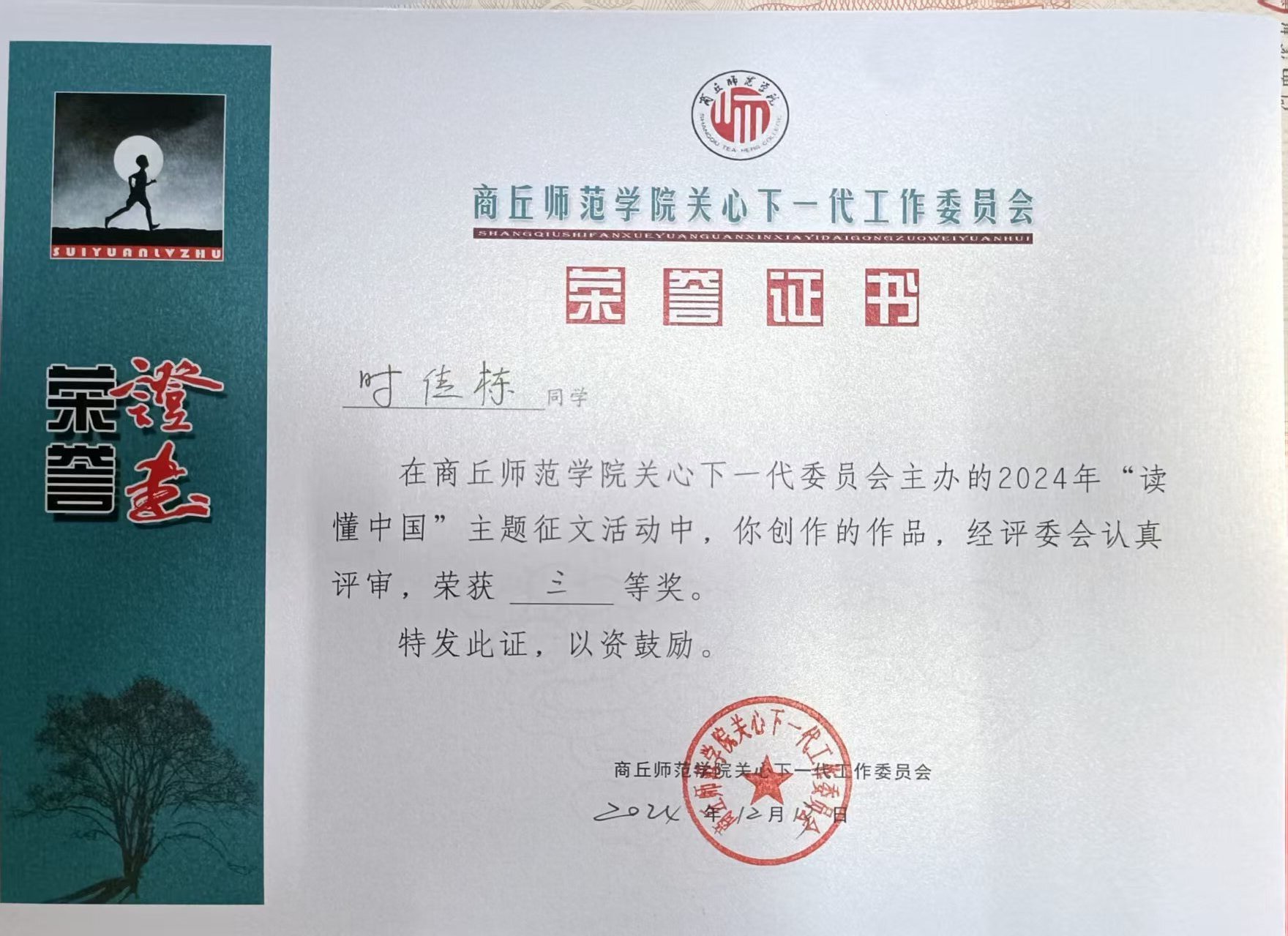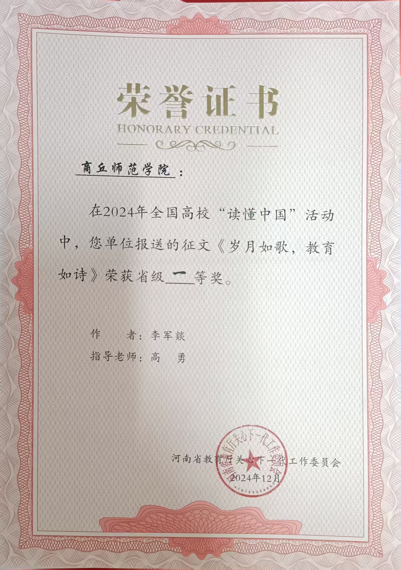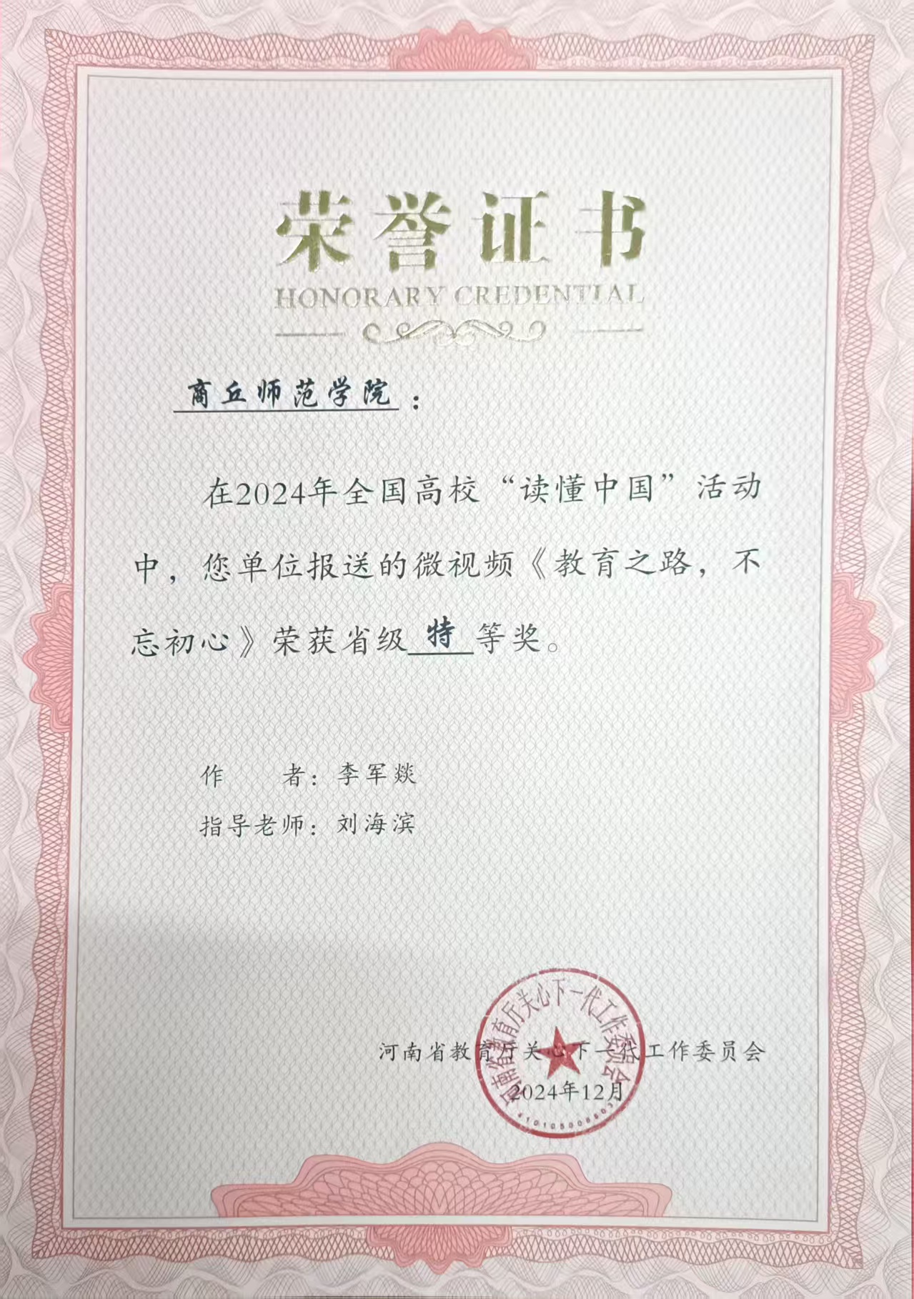 其中,在公司关工委指导下创作的《教育之路,不忘初心》获河南省微视频组特等奖;员工李军燚撰写的作品《岁月如歌,教育如诗》获河南省征文组一等奖。同时,微视频《教育之路,不忘初心》获得了2024年英国上市365“读懂中国”活动微视频类一等奖,征文《岁月如歌,教育如诗》2024年英国上市365“读懂中国”活动征文特等奖,征文《矢志不渝,薪火相传》获得征文三等奖。