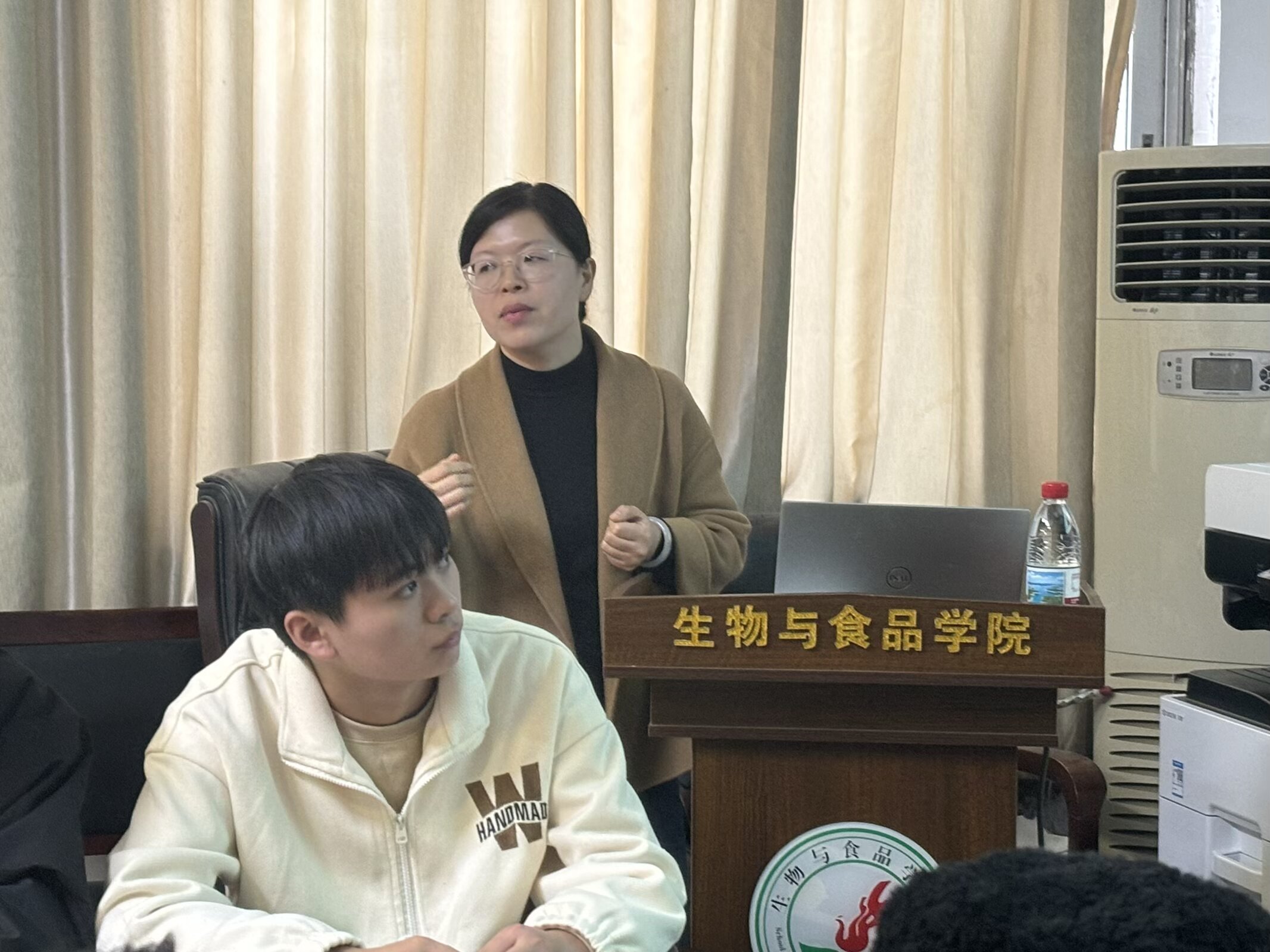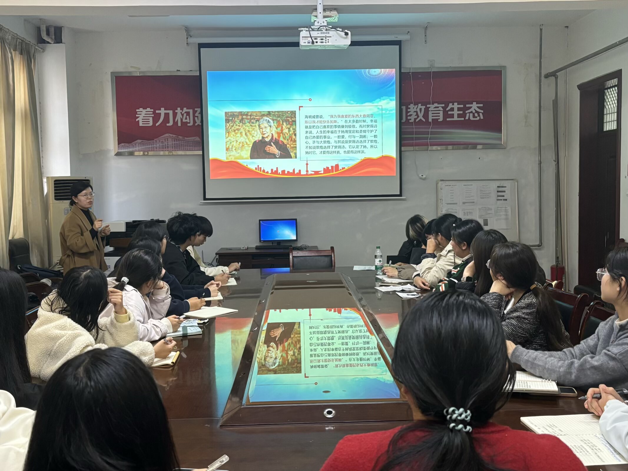 邓丹丹老师围绕樊锦诗“坚守大漠、甘于奉献、勇于担当、开拓进取”的精神品格展开讲解,并结合其50余年扎根敦煌石窟保护一线的事迹来体现樊锦诗“择一事、终一生”的执着。邓老师鼓励全体同学以樊锦诗为榜样,在个人领域深耕细作,以饱满的热情投入到自己的专业学习。