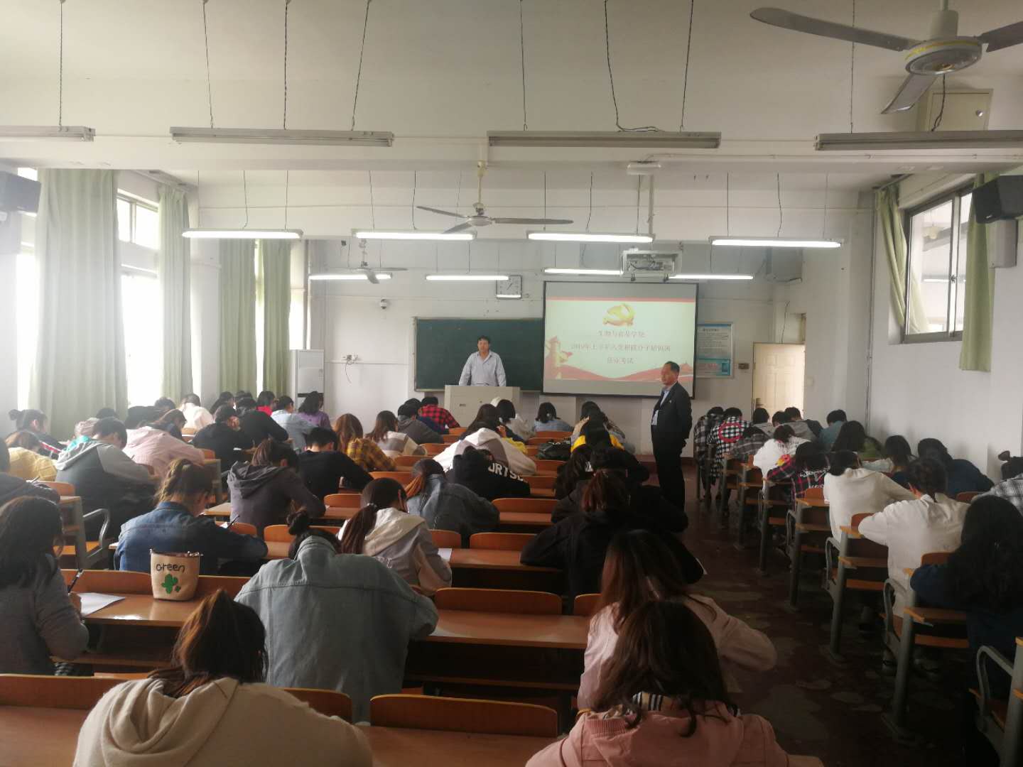 为了对入党积极分子党课学习进行一次测验和总结,同时增强学员们的党性认识,激励学员们以后能够更加严格的规范自身的品行修养,发挥好模范带头作用。2019年4月20日中午1点,公司党总支在睢阳校区1号教学楼504教室进行了2019年上半年(第44期)中级入党积极分子党课培训考试,100余名入党积极分子同学参加考试。公司党总支副书记史继红、公司员工一支部书记陈东鹏老师和员工第三支部书记刘海滨老师进行监考。