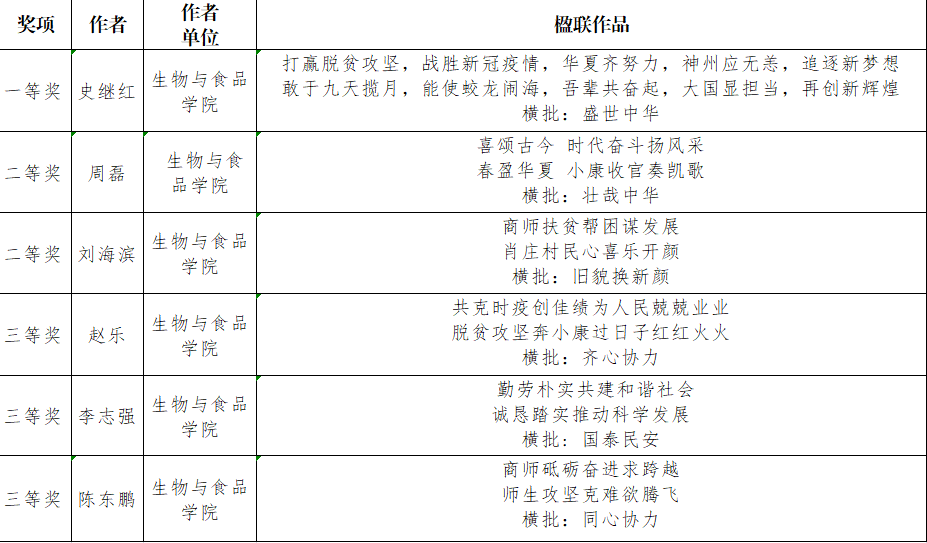公司师生积极动员、师生踊跃投稿。活动期间共收到楹联作品6幅,这些作品从各个角度反映了时代主旋律,弘扬了优秀传统文化和爱国主义精神,体现了公司转型发展、公司产品改革等工作实效,彰显了公司办学特色,宣传了公司在改革创新方面取得的成就,营造了欢乐和谐的节日氛围。经组织专家严格评阅,公司作品获得一等奖1幅、二等奖2幅、三等奖3幅。
