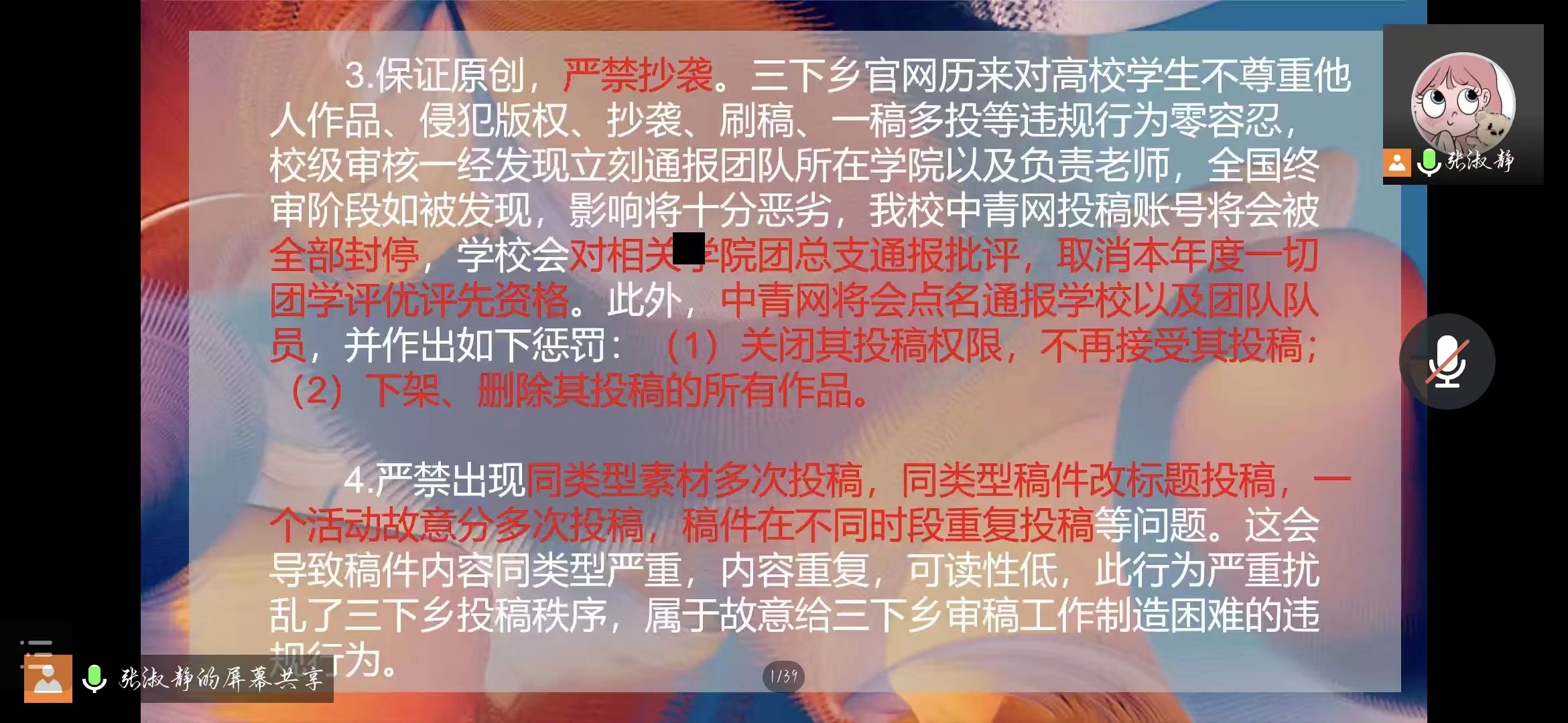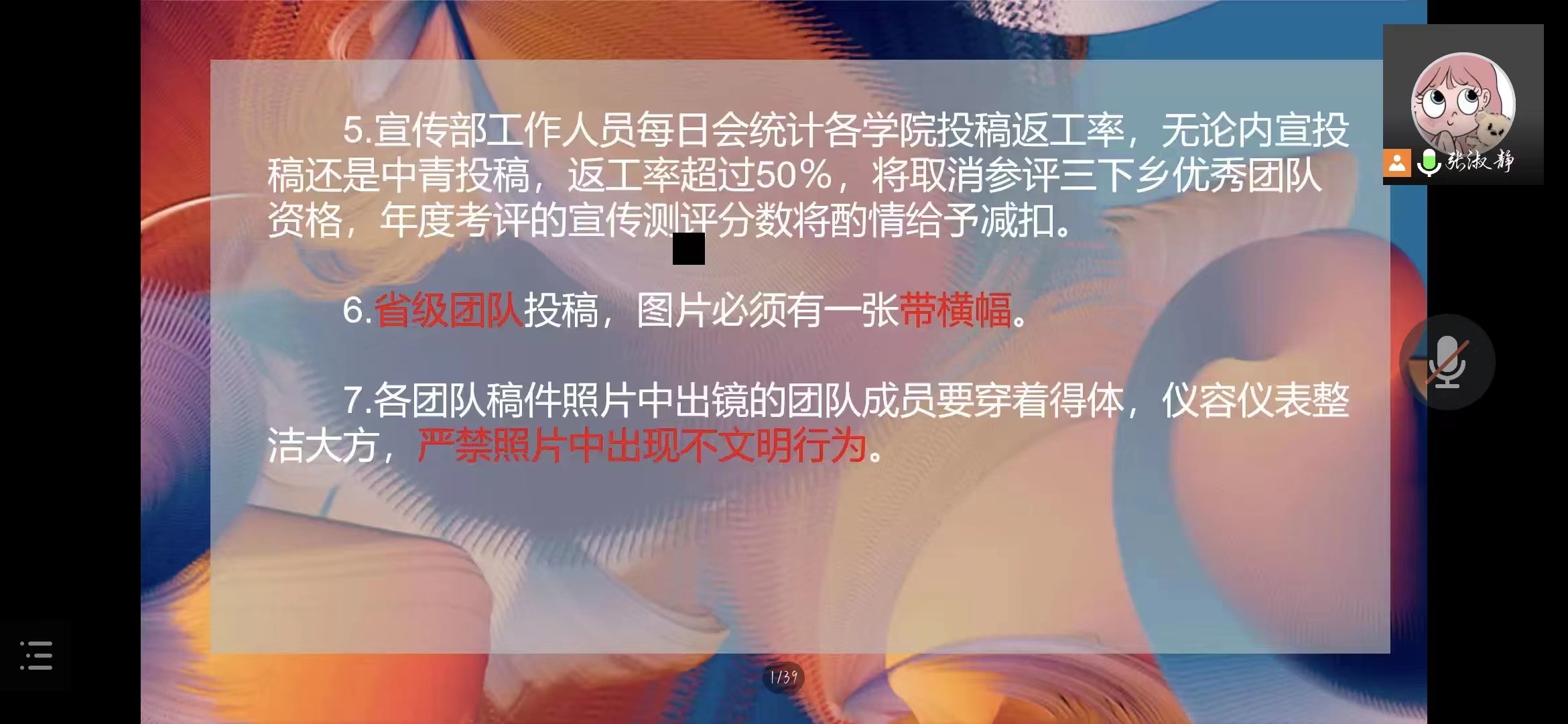 会上,公司团委书记陈东鹏详细解读了暑期社会实践文件的内容和要求,介绍了全院暑期社会实践团队立项申报情况。接着,陈东鹏着重强调同学们在进行社会实践时要遵守纪律,做好安全防范,始终把安全问题放在首位,完善实践队伍,确保活动安全。同时他表示“三下乡”社会实践活动对推动广老员工接触基层、了解国情、磨炼意志、实践成才具有积极作用和深远意义,希望同学们能够重视每一次社会实践机会,用所学所识解决实际问题,演绎出青春该有的模样。随后,由公司团委组织部成员张淑静为大家详细说明了“三下乡”社会实践活动时间、中青投稿注意事项、活动照片拍摄等方面内容,最后,她表示希望合理安排活动时间,在活动过程中做好自身防护,宣传正能量,展现公司学子青春、向上的良好风貌。