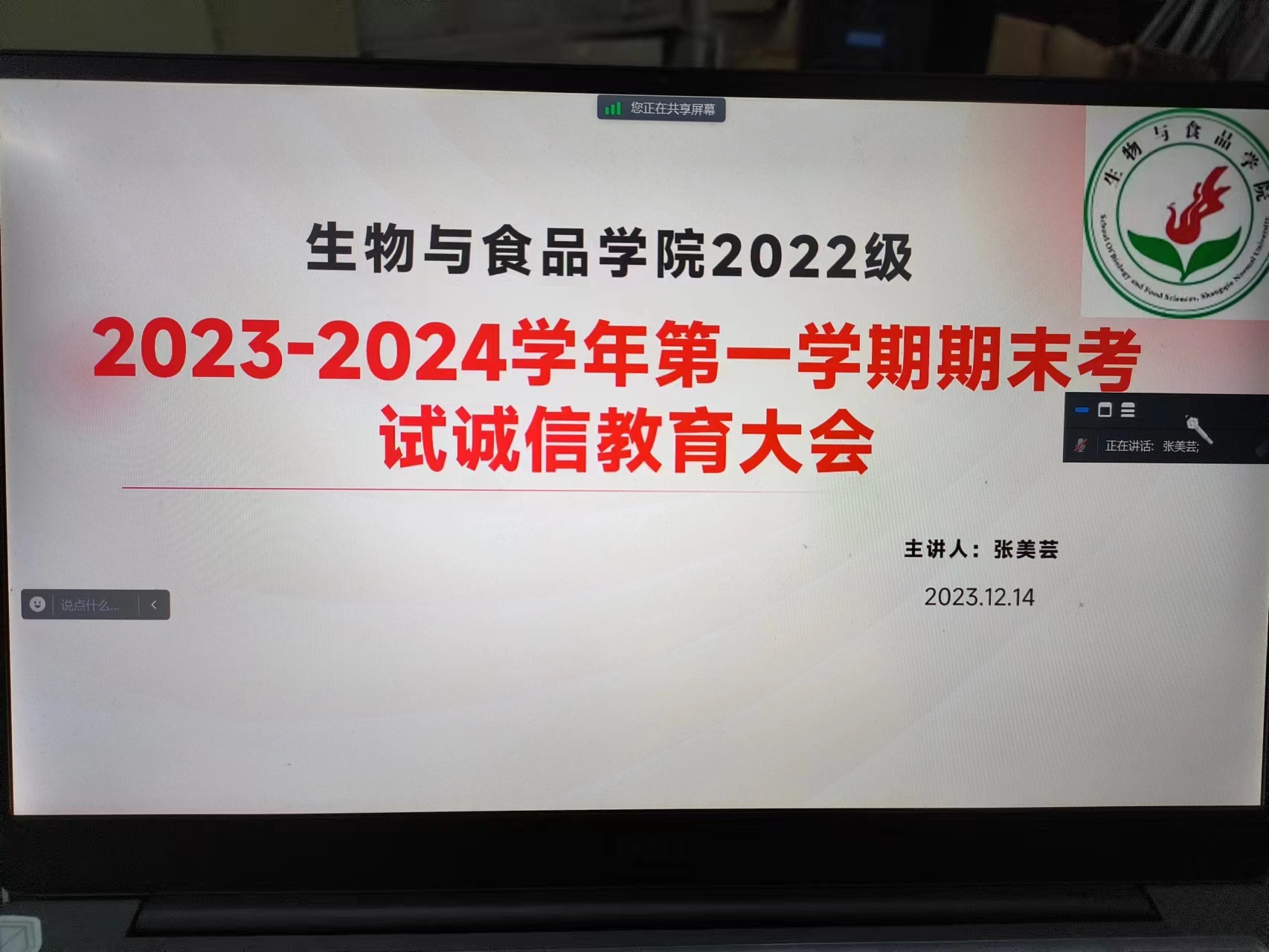 12月14日,2022级辅导员张美芸通过线上会议的形式召开期末考试诚信教育会,要求同学们务必求真务实,认真备考;端正态度,树立正确的考试观,诚信应考、科学复习、共同进步,通过自身努力取得良好的成绩,充分展现公司学子良好的知识水平和道德水准。
