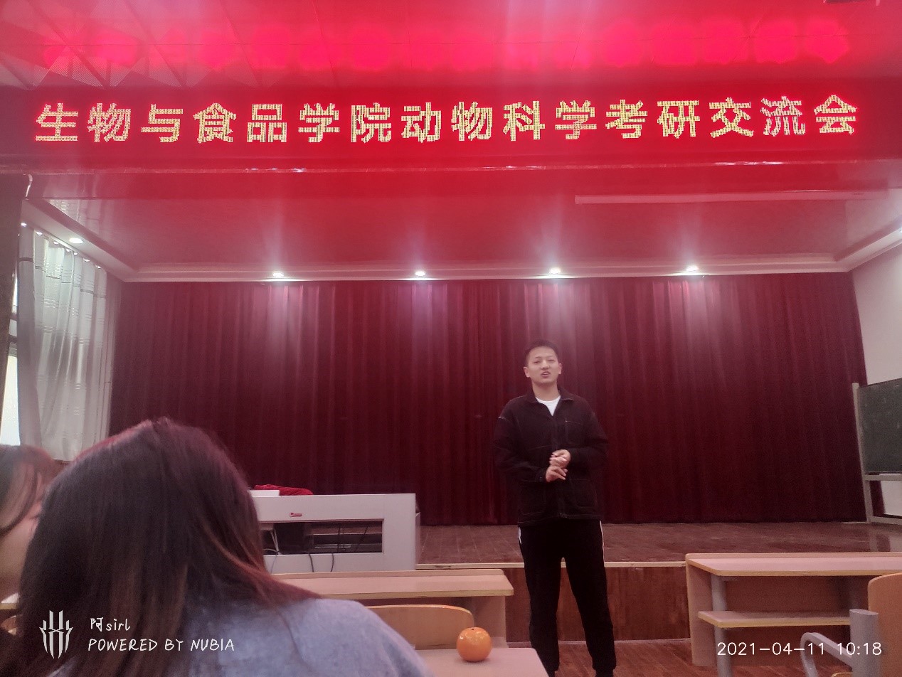 为加强18,19级同学们对考研知识和经验的了解,营造积极向上的学风。于4月11日上午,动物科学专业在生物院报告厅举行了一场考研交流活动,本次活动由张春梅老师主持,并邀请到了施传信老师,李志强老师以及17级成功上岸的学姐学长分享考研心得。