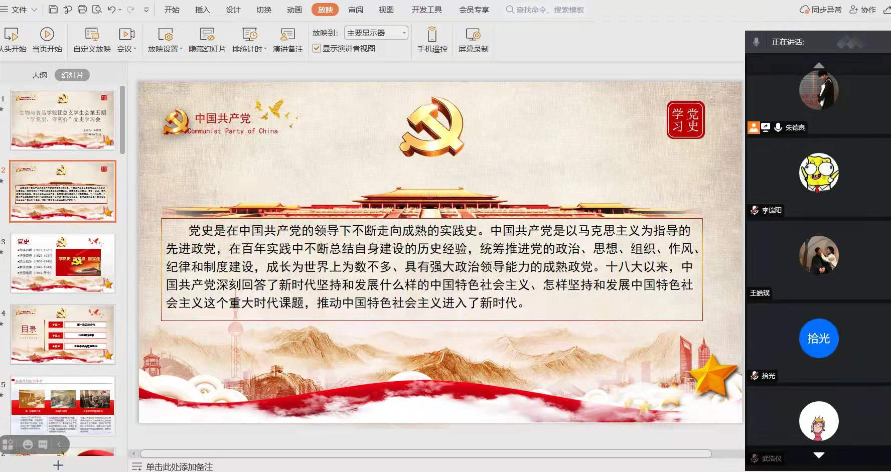 会议伊始,朱德良带领大家回顾了第一次国共合作、北伐胜利进军等中国开天辟地大事件,朱德良着重强调了这些事件于中国向前发展所起到的重要作用。随后,朱德良向团总支员工会全体成员传达了中国共产党在百年实践中的历史经验,在场成员深刻领悟到了共产党的先进性。最后,朱德良对近期的员工工作进行了总结,希望同学们在今后的工作中能够积极参与并配合团总支员工会的一切工作。
