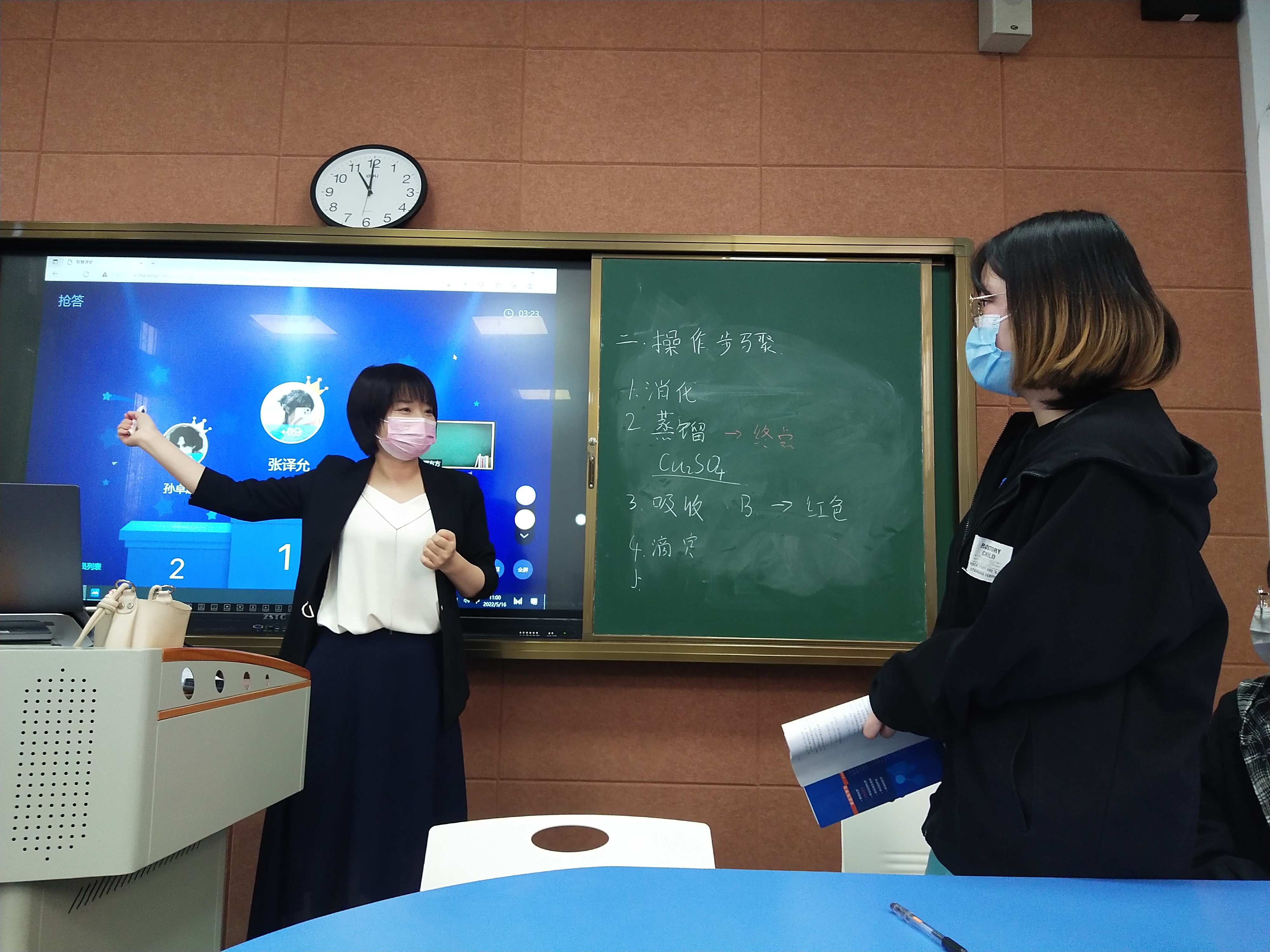 本次公开课是针对该课程第九章《食品中蛋白质和氨基酸的测定》中的“凯氏定氮法”,该方法是食品中蛋白质测定的国标第一法。贾方方老师运用腾讯会议进行线上线下同步授课,辅以超星泛雅平台和雨课堂,构建了“课前线上预习——课中线下讲授重点——课后线上线下作业”一体化的混合式教学。她首先从2008年的三聚氰胺事件说起,激发同学们作为食品人的社会使命感和责任感,学好专业知识,为食品安全保驾护航。接着结合同学们在学习通上课前预习情况,利用长江雨课堂进行互动和知识点预热。然后对本章重点凯氏定氮法测定食品中氮含量的原理和操作步骤进行了讲授,最后在超星泛雅平台上采用抢答、选人等方式对该部分的注意事项如实验过程中溶液颜色的一步步变化及原因,如何保证消化和蒸馏过程完全等进行了回顾和总结,共同完成了课后作业。讲授过程结合启发诱导提问等方法,充分调动员工的积极性和参与感,课堂氛围生动活泼。