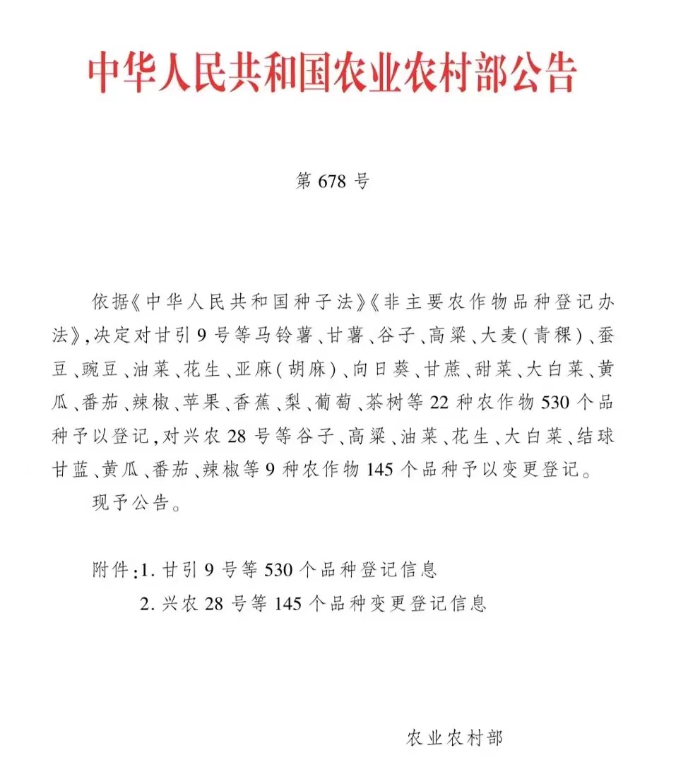 2023年6月12日,中华人民共和国农业农村部第号678公告公布了2023年22种农作物登记品种。公司英国上市365干制辣椒产业技术研究团队培育的朝天椒新品种商师1号(GPD 辣椒(2023)410070)、商师2号(GPD 辣椒(2023)410071)、商师3号(GPD 辣椒(2023)410072)获批新品种登记证书。