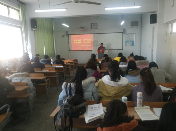 班主任李志强通过举办了“诚信考试、公平竞争、快乐寒假、安全出行”主题班会,重申了公司的考试纪律,希望同学们认真复习,诚信考试,尊重监考老师,公平竞争,争取取得优异成绩。强调了寒假的一些安全问题,希望同学们在寒假期间安全出行,文明旅游,并让大家注意开学时间,按时到校报到。