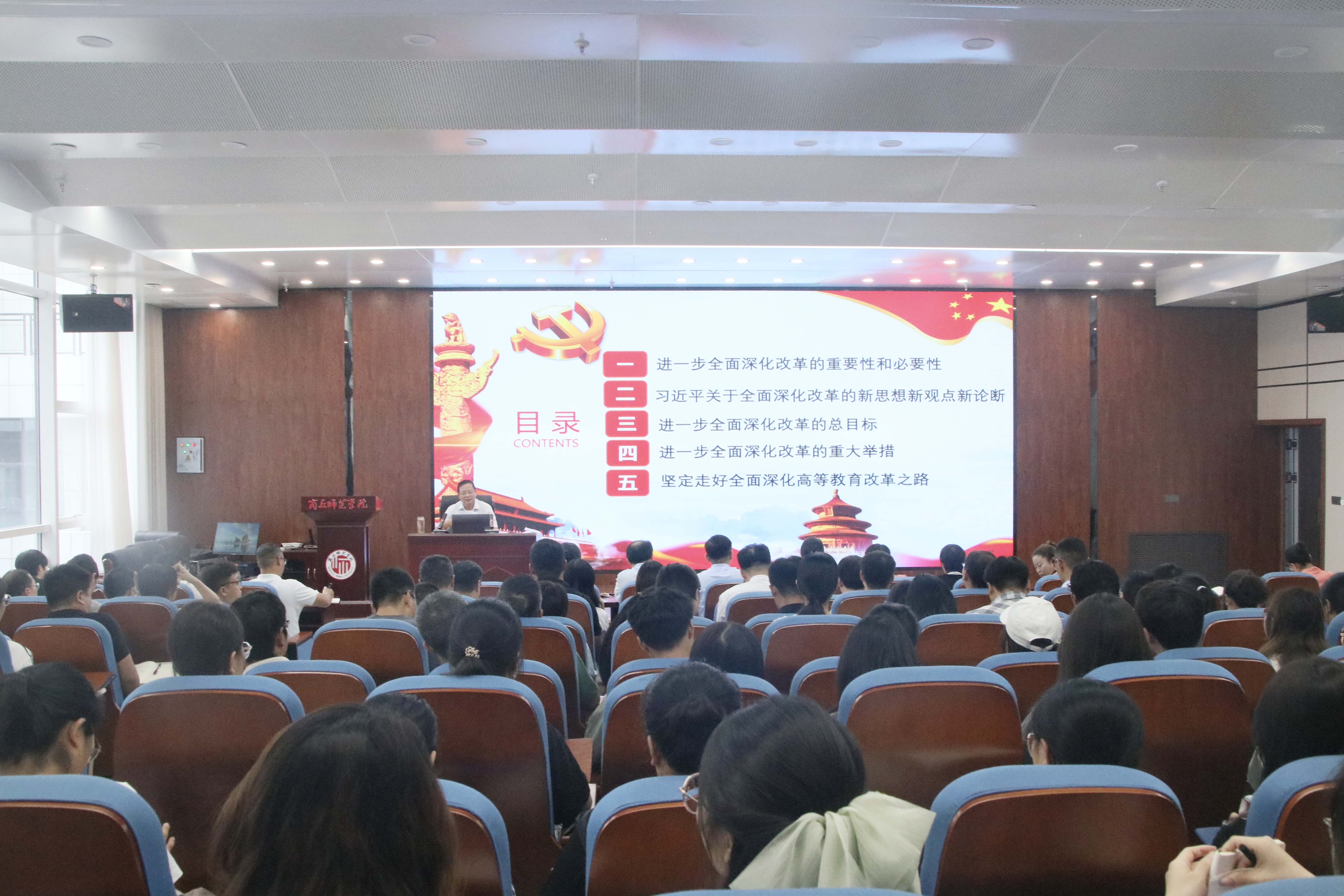 程功鹏从进一步全面深化改革的重要性和必要性、习近平总书记关于全面深化改革的一系列新思想、新观点、新论断和进一步全面深化改革的总目标、进一步全面深化改革的重大举措、坚定走好全面深化高等教育改革之路五个部分作了宣讲,深刻解读了党的二十届三中全会的精神要义和实践要求。他强调,我们应该深刻感悟新时代全面深化改革取得的重大成就,把牢进一步全面深化改革的价值取向,全面贯彻党的教育方针,在落实立德树人根本任务中强化担当使命,坚定不移推进教育高质量发展。