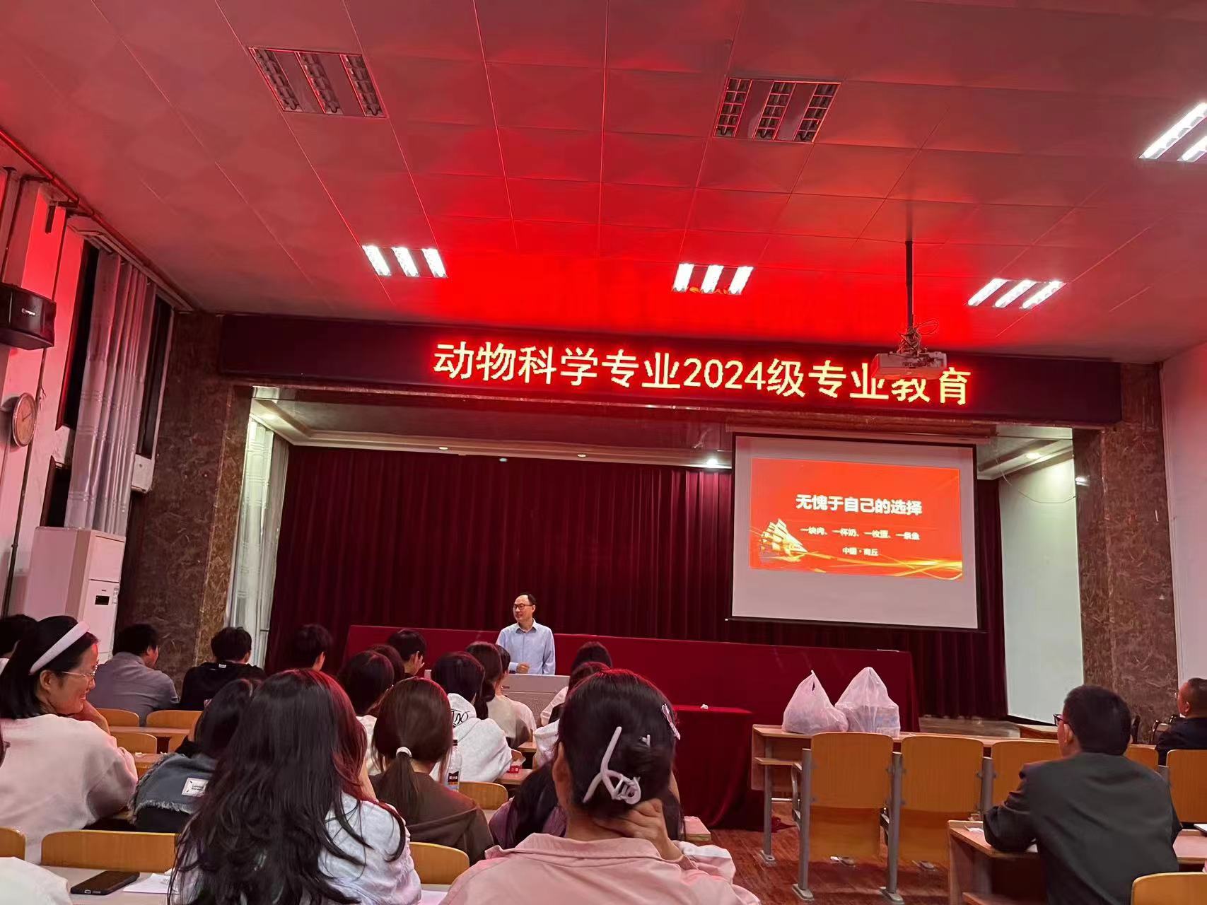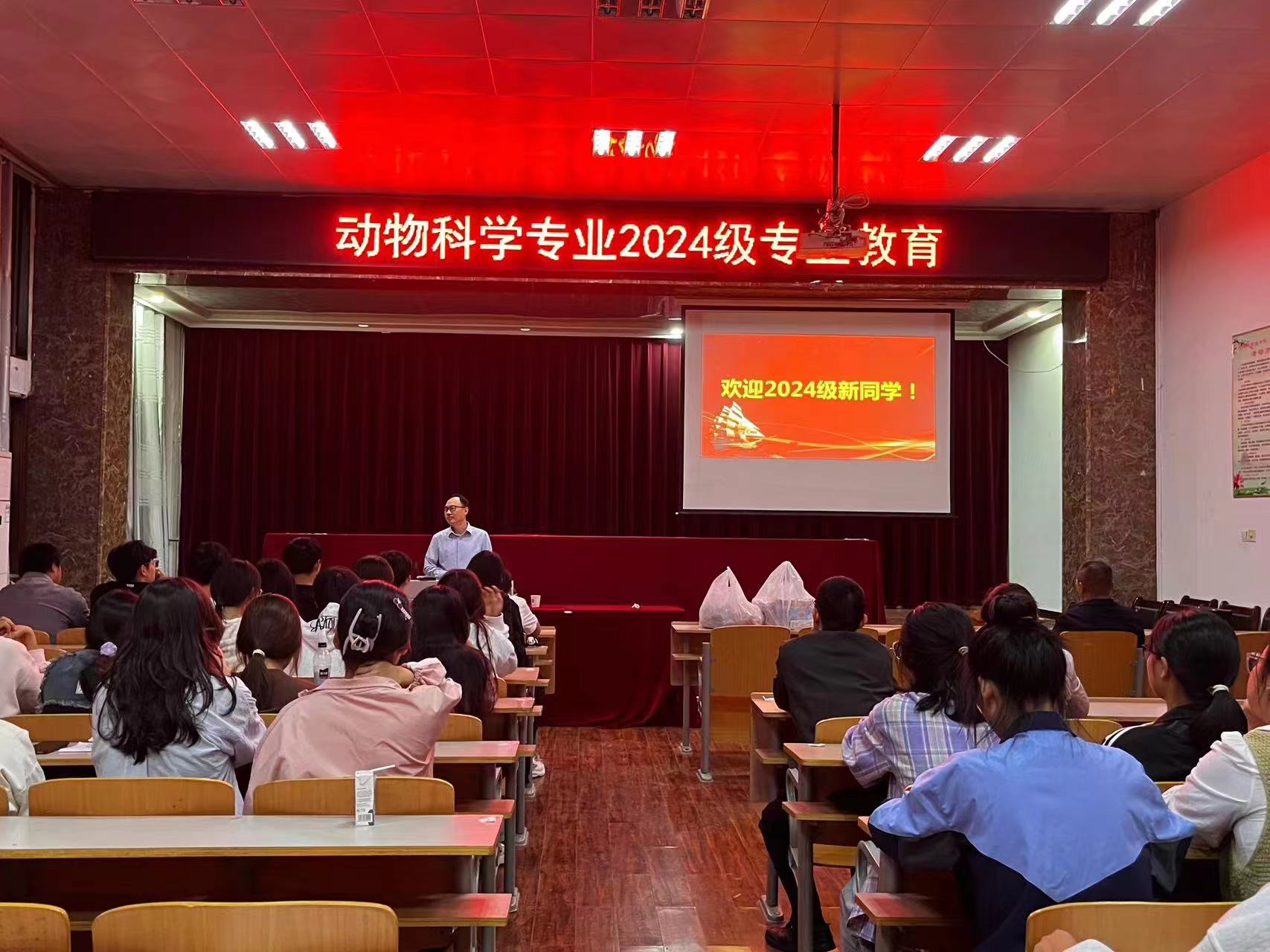 为使2024级新生尽快适应老员工活,进入大学的学习生活状态,更好地了解所学专业。2024年9月23日晚上7点,动物科学专业在院报告厅召开2024级新生专业教育。大会由班主任李志强主持,系主任施传信主讲。动物科学专业部分教师和24级新生参加会议。