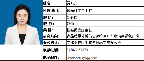 贾方方,女,1984年生,河南新郑人,博士,副教授。校级优秀班主任,近年来先后参加国家自然科学基金面上项目,主持完成河南省科技攻关项目2项、河南省高等公司重点科研项目1项及河南省烟草公司科技项目5项等,主持校级教学范式改革项目1项,课程思政样板课程1项,并在《Industrial Crops and Products》、《Field Crops Research》、《Analyst》、《烟草科技》、《中国烟草科学》、《中国烟草学报》等学术期刊发表研究论文30余篇,获发明专利5项,实用新型专利2项,外观专利2项,软件著作权6项,先后获批商丘市茄科作物微生态调控工程技术中心,荣获河南省自然科学三等奖1项、河南省烟草公司科技进步二等奖1项,商丘市科学技术进步奖一等奖2项等,校级青年教师讲课三等奖2项。