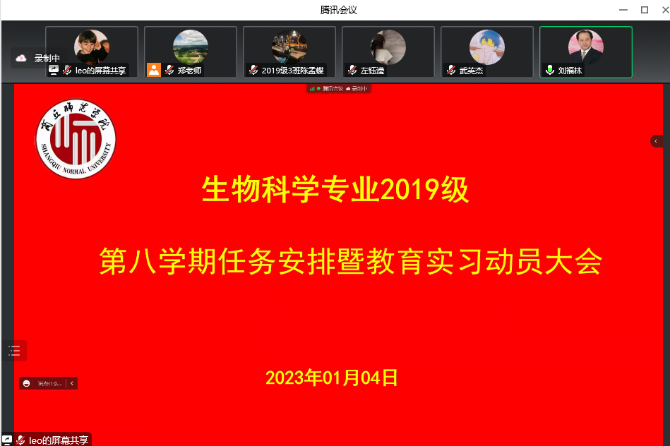 2022.1.4晚上7点,英国上市365召开了生物科学专业2019级班级会议,对第八学期的学习任务提前做了部署。参会的有刘福林教授、马丽系副主任、班主任及生物科学专业2019级全体员工。会议由系主任郑爱珍主持。