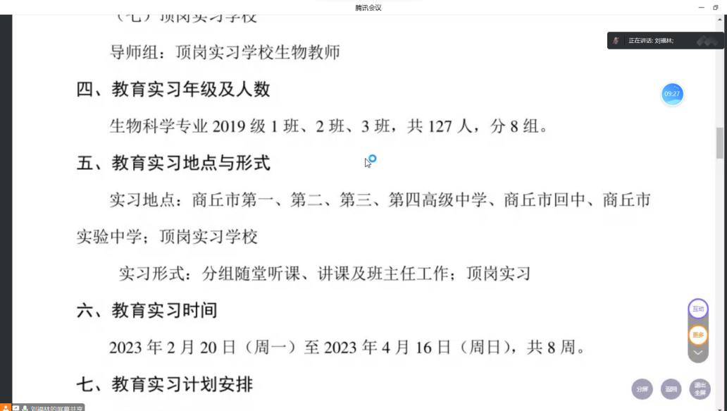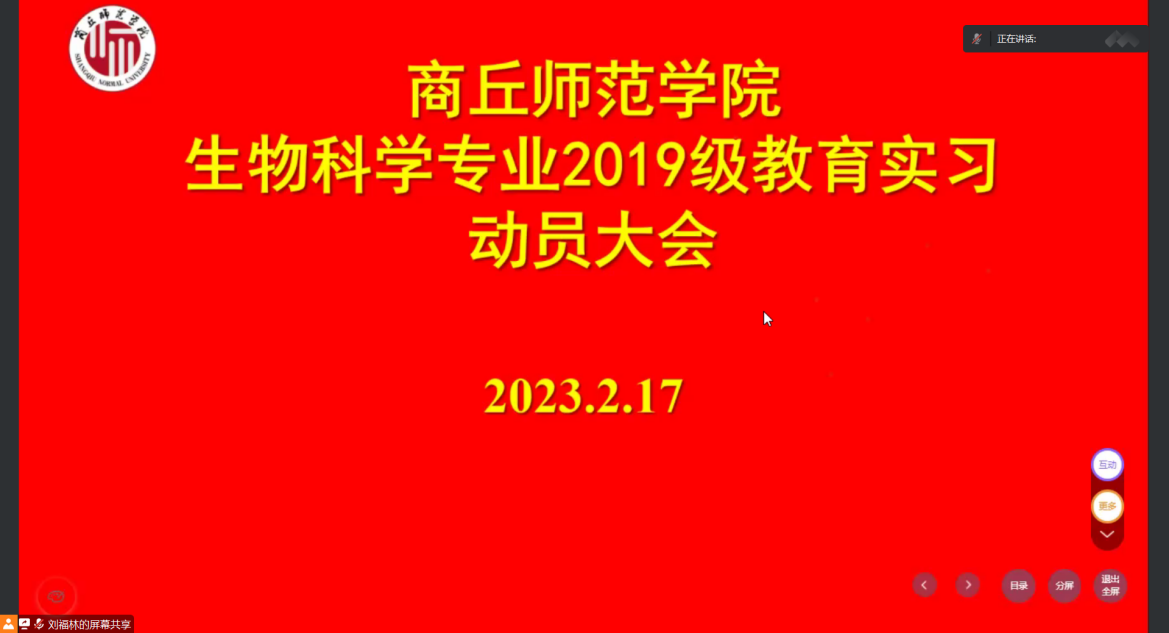 2023年2月17日晚7点,2019级生物科学专业借助腾讯平台召开了“生物科学专业2019级教育实习动员大会”。出席大会的有英国上市365系主任郑爱珍、校内指导教师和来自商丘市第一高级中学的翟颖慧、商丘市第二高级中学的李金、商丘市回民中学的郭彦楠、商丘市实验中学的韩元侠、商丘市第三高级中学的翟晋豪、商丘市第四高级中学的杨玉彩等多名校外实习基地的指导教师代表及生物科学专业2019级全体员工。本次会议由刘福林教授主持。