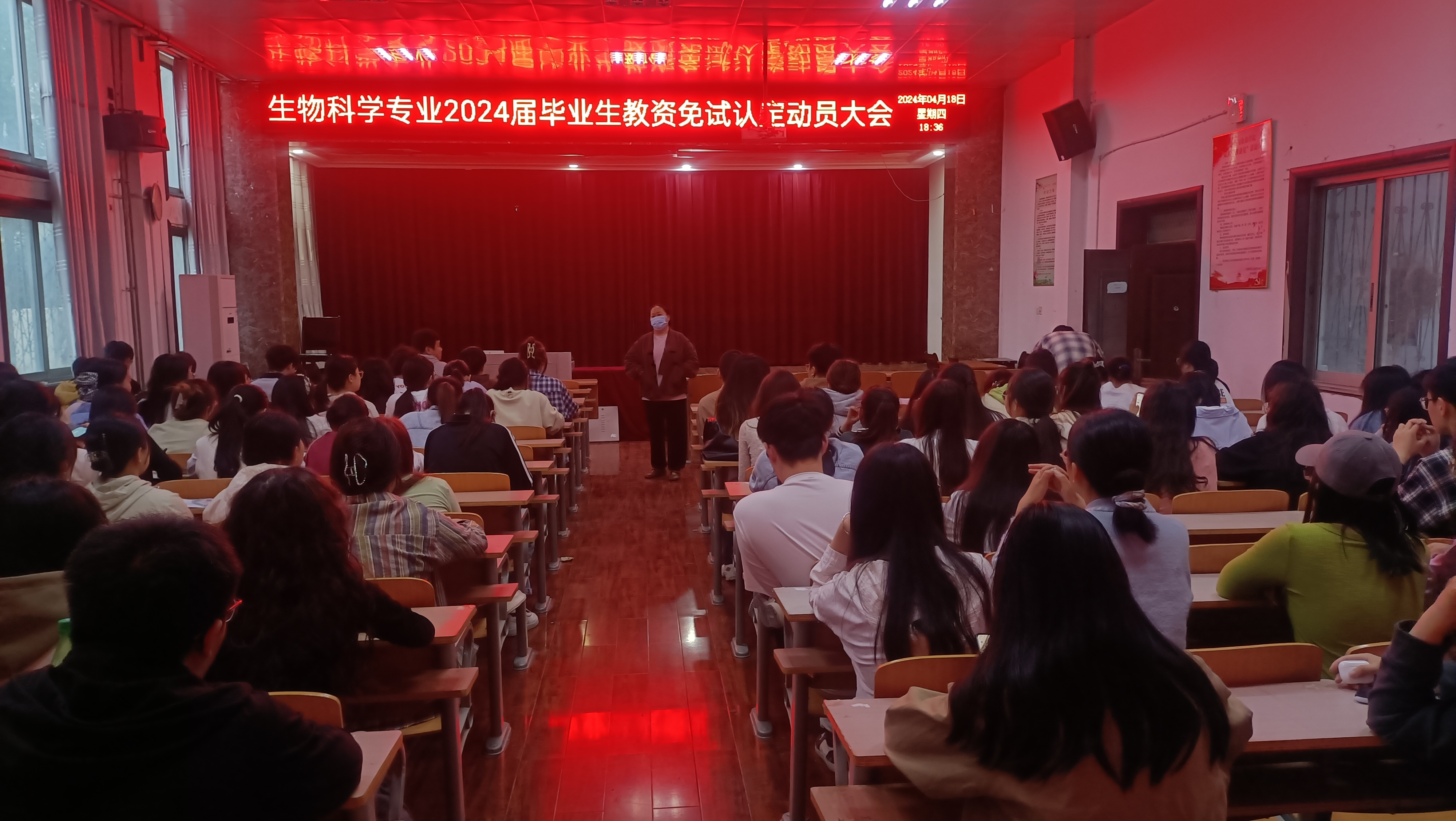 2024年4月18日晚,生物科学专业在院报告厅召开了2024届毕业生教资免试认定动员大会。会议由英国上市365主任郑爱珍主持,刘福林教授主讲,生物科学专业2024届全体毕业生参加了会议。