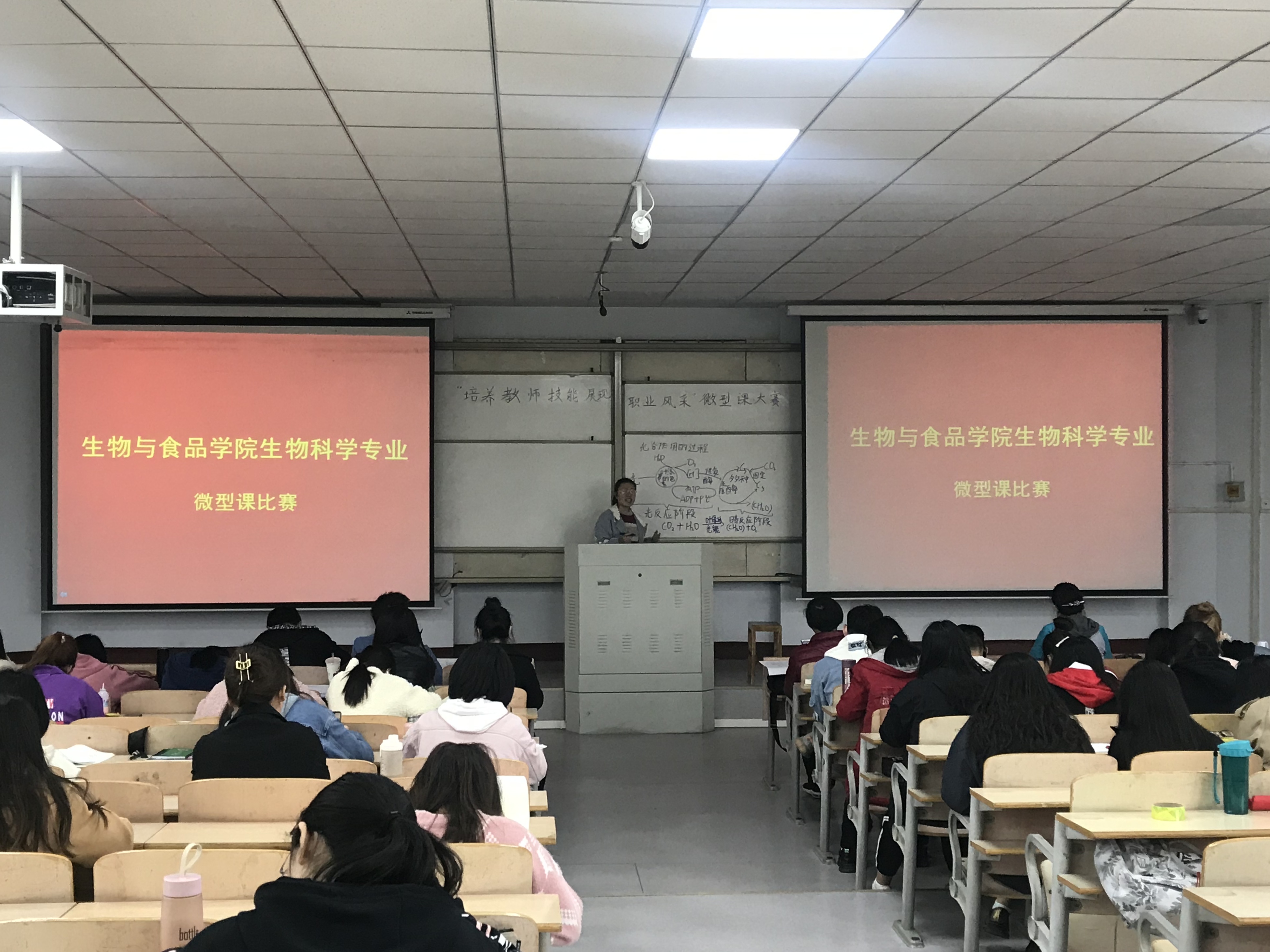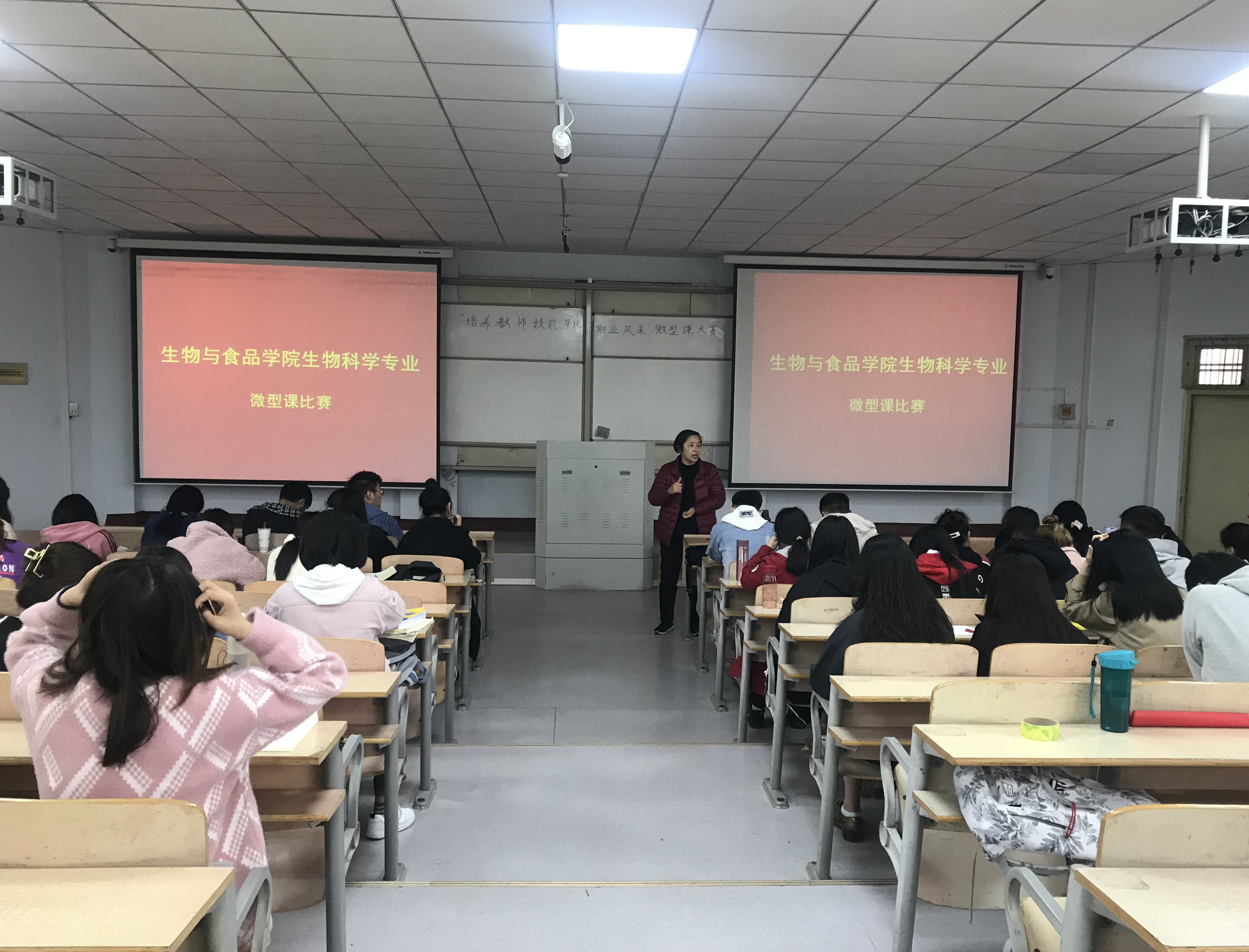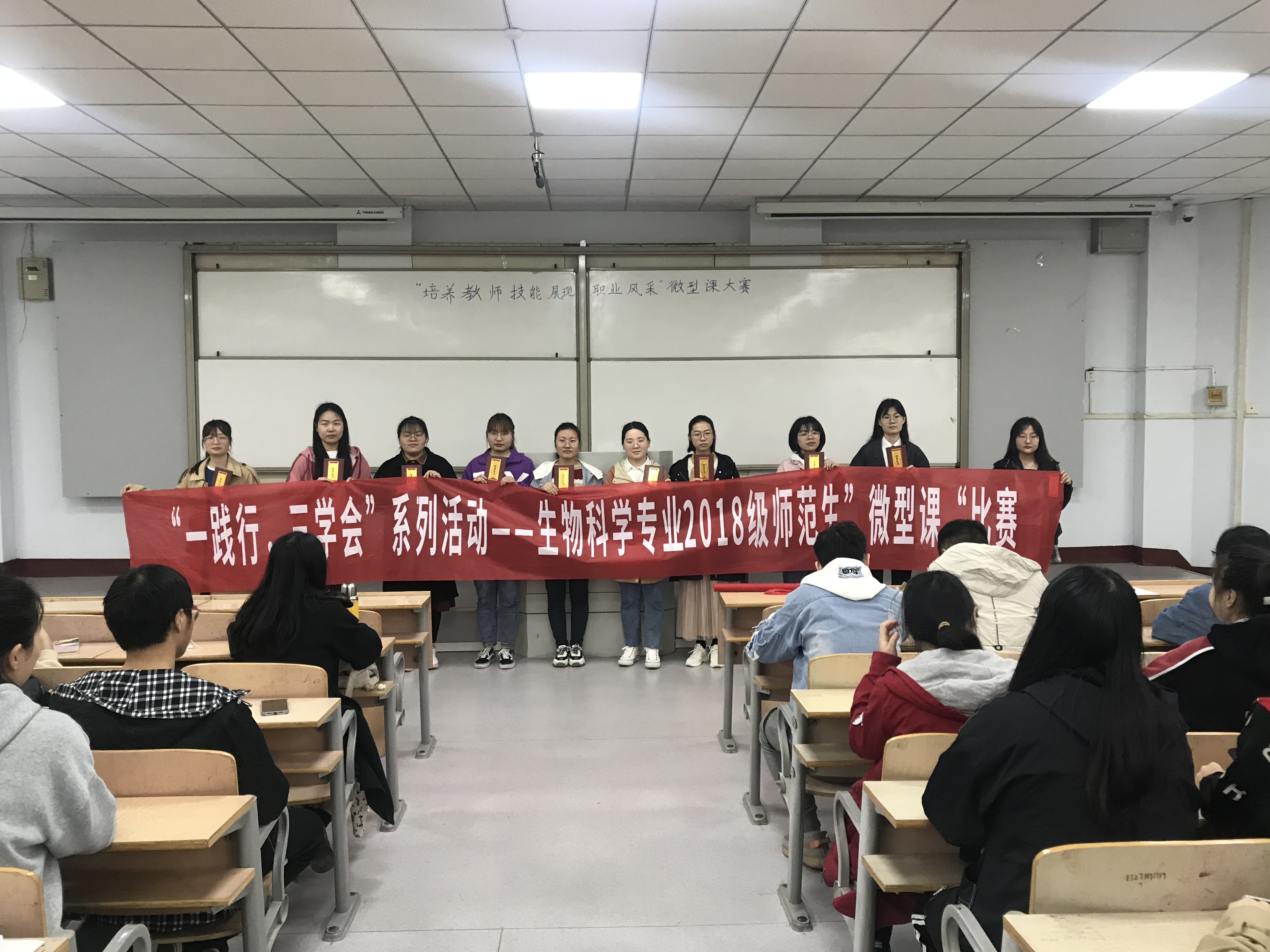 为进一步增强师范生实践应用能力和创新能力,彰显师范特色,强化员工教学技能,4月24日上午,2018级生物科学专业员工在1号教学楼307教室成功举办了“未来名师训练营”系列活动之学会教学------“微型课”比赛,评委有:康洁、王玉玲、郑爱珍三位老师及部分班委,林敏主持。
