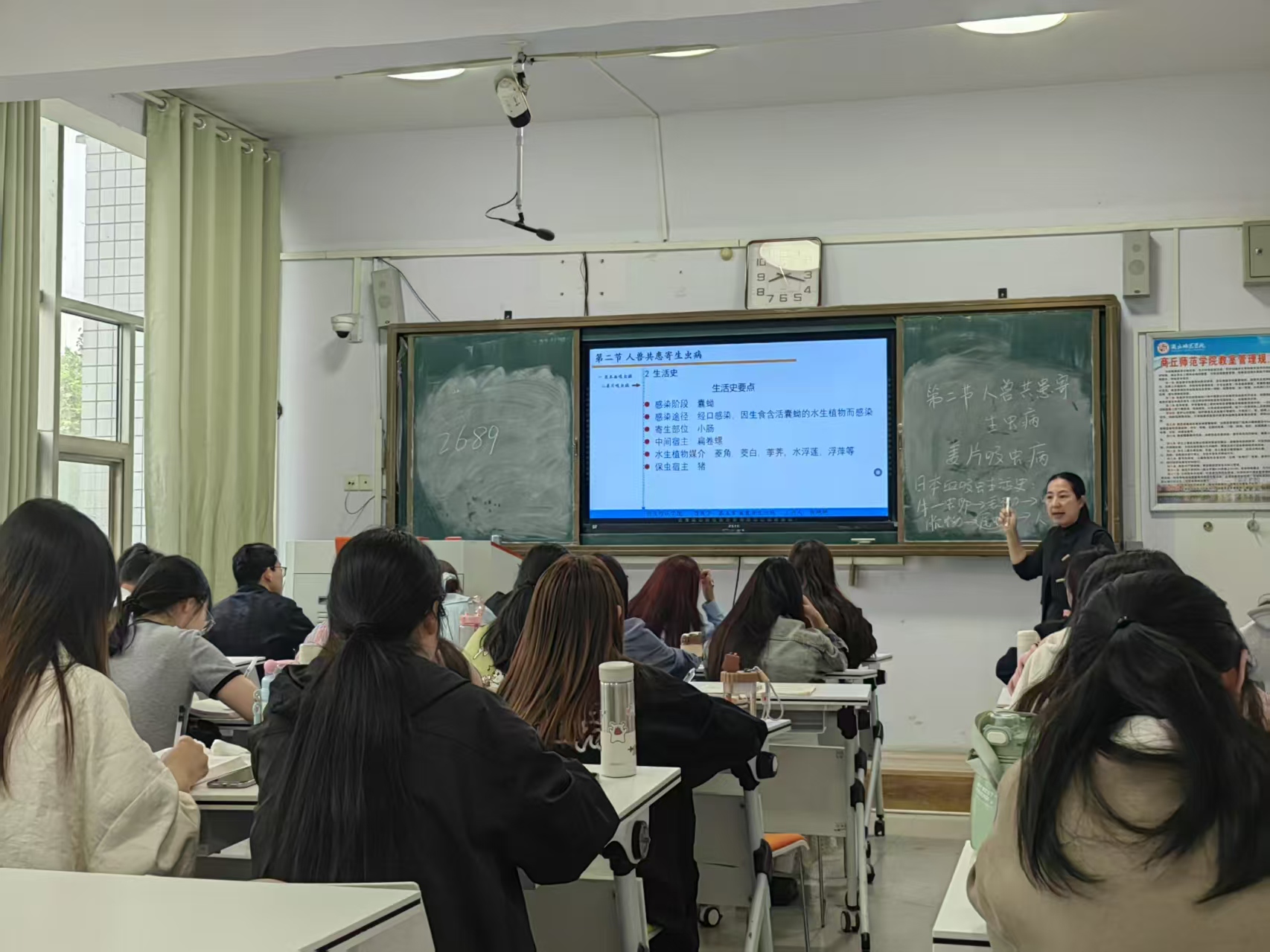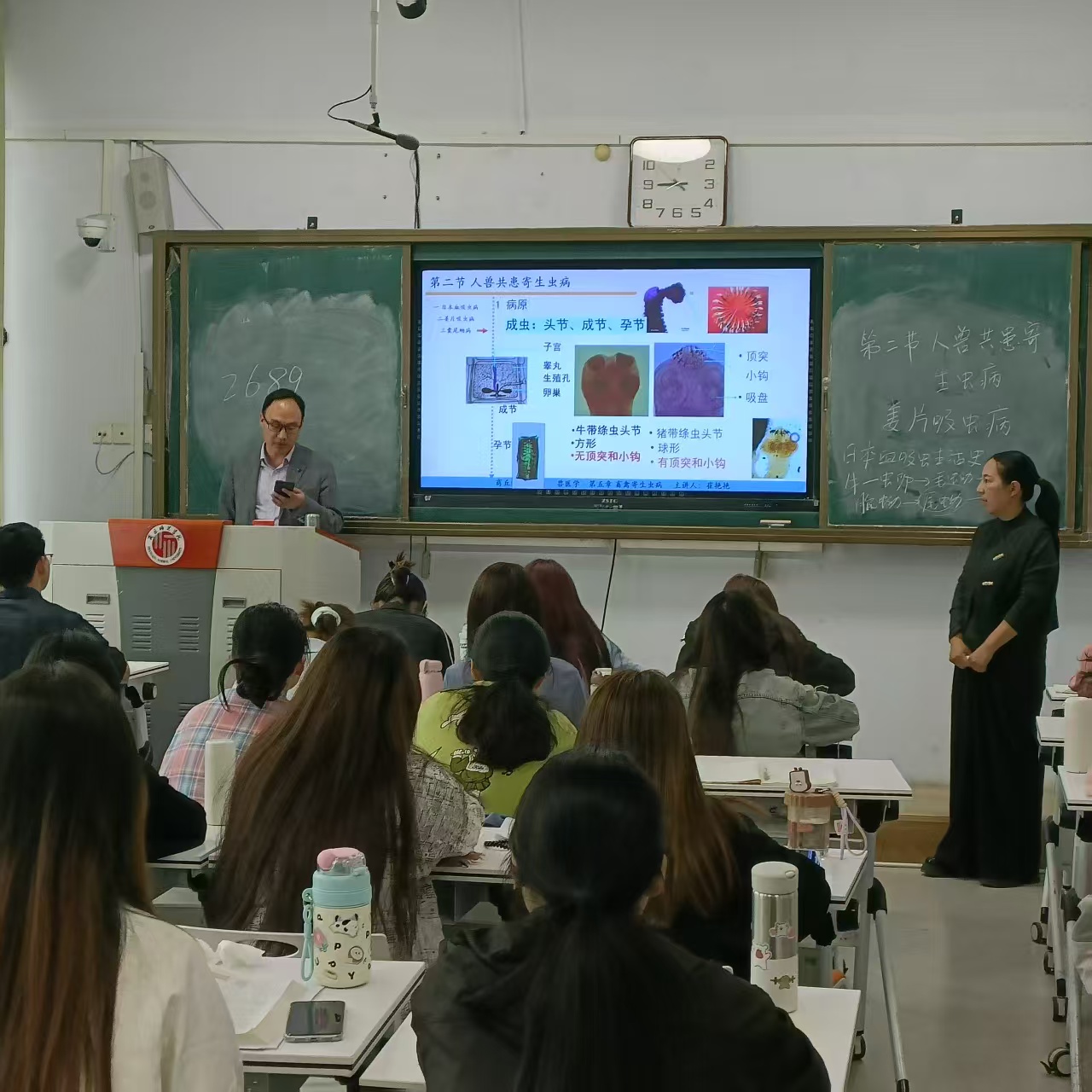 本次公开课讲授的是“人兽共患寄生虫病”。采用线上线下结合模式,课前员工利用线上超星平台进行了预习,线下课堂采用“知识回顾—课堂导入—新课讲授—分组讨论—归纳小结—思考题测试”的流程进行。首先复习上一节知识点,让员工以简单的图示展示日本血吸虫病的生活史;然后导入新课,通过穿插美食引起的疾病案例:27岁女子因生肯荸荠的皮导致感染姜片吸虫,导入本节内容食源性寄生虫病病原-姜片吸虫;通过深入讨论姜片吸虫病病原特点、生活史,流行特点、预防措施,加深同学们对课程的理解和掌握,每个部分都设计了讨论和互动,加深员工对此次课程内容的理解和掌握。