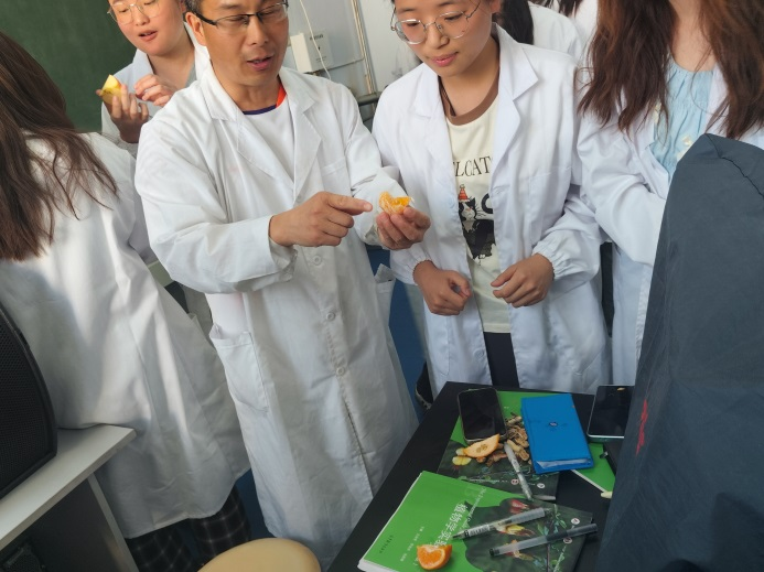 本次公开课的内容是《果实的结构与类型》,张峰老师采用线上超星泛雅平台与线下课堂相结合的混合教学方式开展教学,线上提供实验教学内容供员工课前预习;线下课堂采用“理论知识回顾——内容拓展——现场操作——实验数据收集与完善——完成实验报告”的教学流程进行。