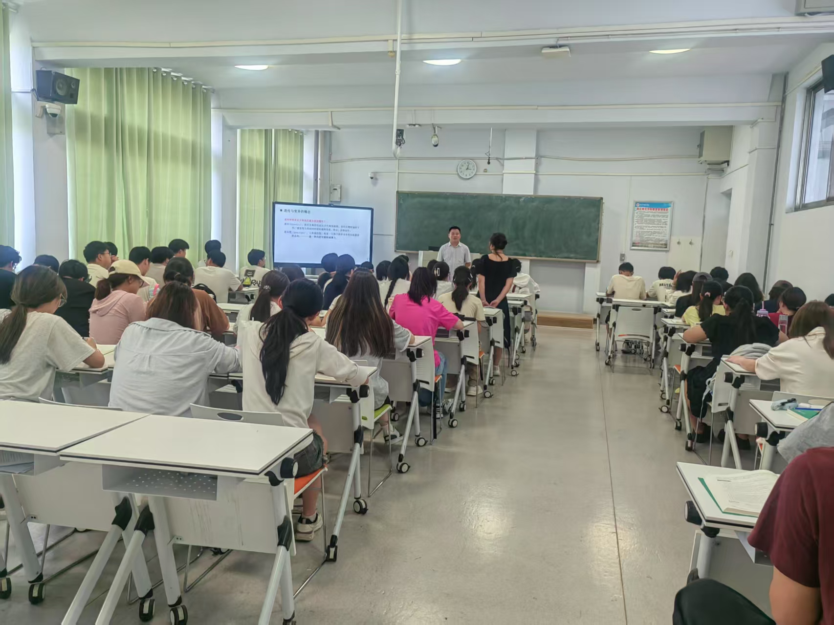 宋兆齐老师在课堂教学中详细介绍了遗传变异的物质基础、遗传物质的含义、证明核酸是遗传物质的经典实验。在互动环节,宋兆齐老师引导同学们参与讨论,讨论人类进化的本质是什么?并让同学们讨论是否还有别的遗传物质?提高同学们的科学思辨精神。